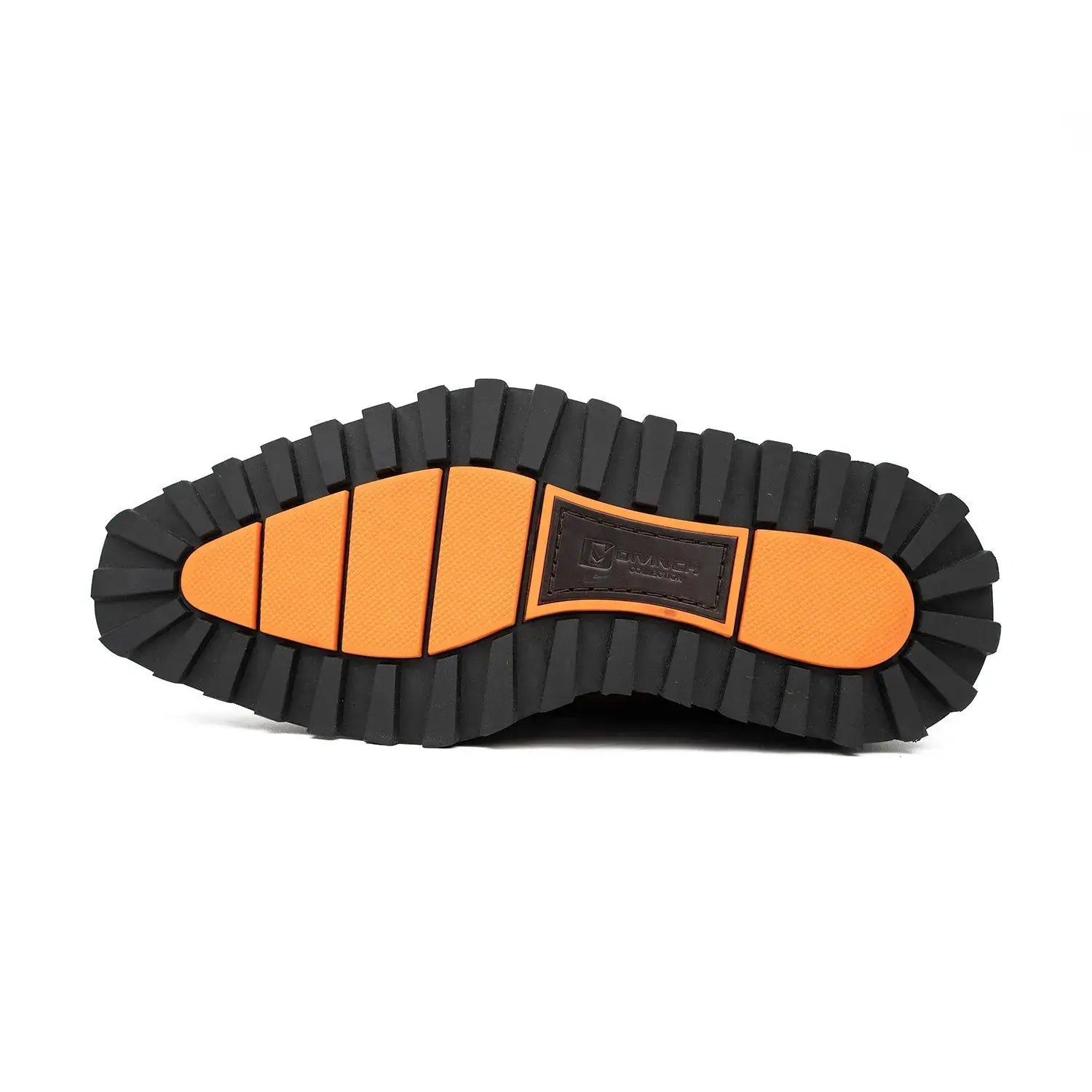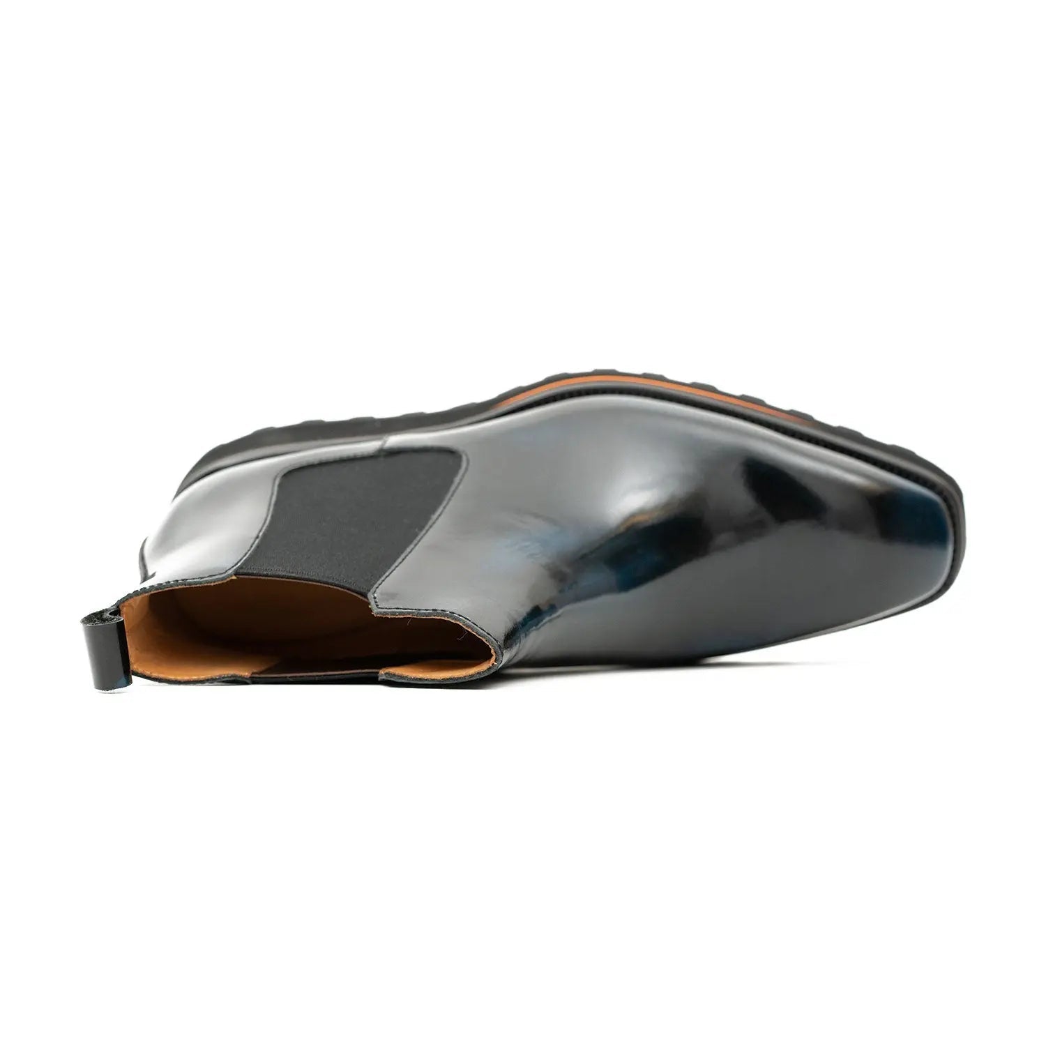 This men's thick-soled Foil leather Chelsea boot is available in four colors: brown, black, coffee, and blue. The upper is made from premium calf leather, with a matching leather interior for exceptional comfort. The elastic slip-on design ensures easy wearing, while the 6 cm thick sole enhances durability and comfort.