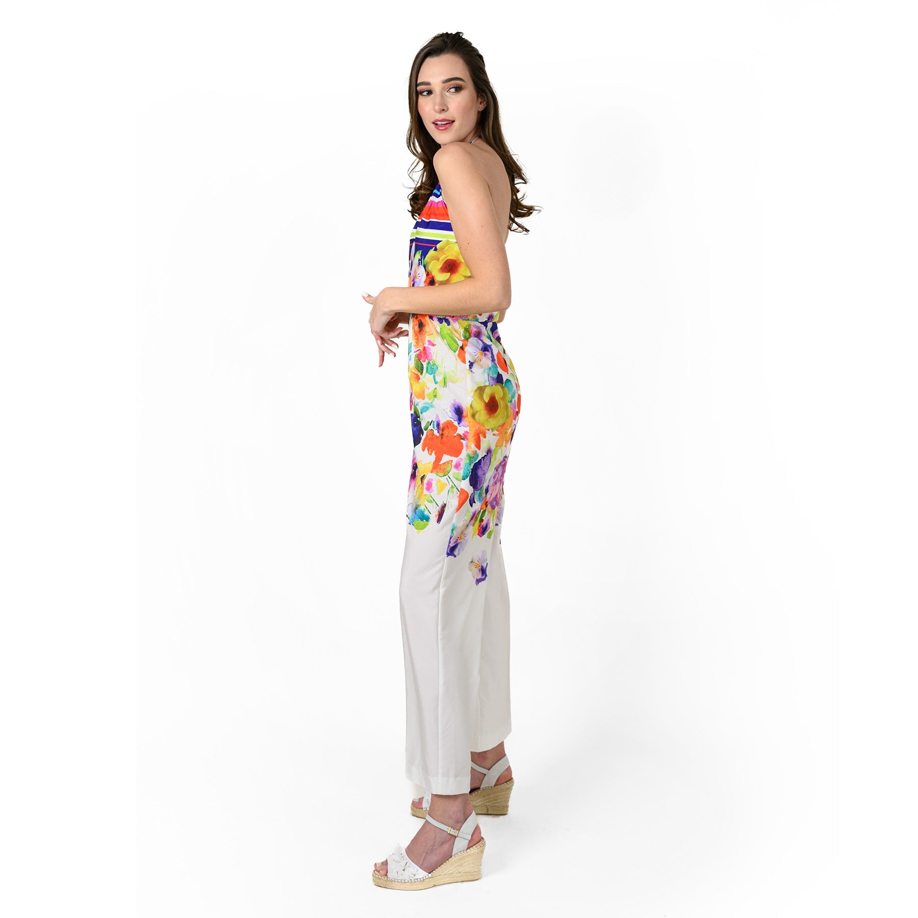 The pinnacle of seasonal style, this jumpsuit features bold abstract prints and a colorblock-inspired silhouette you'll love. Unique and stylish halter neck.
