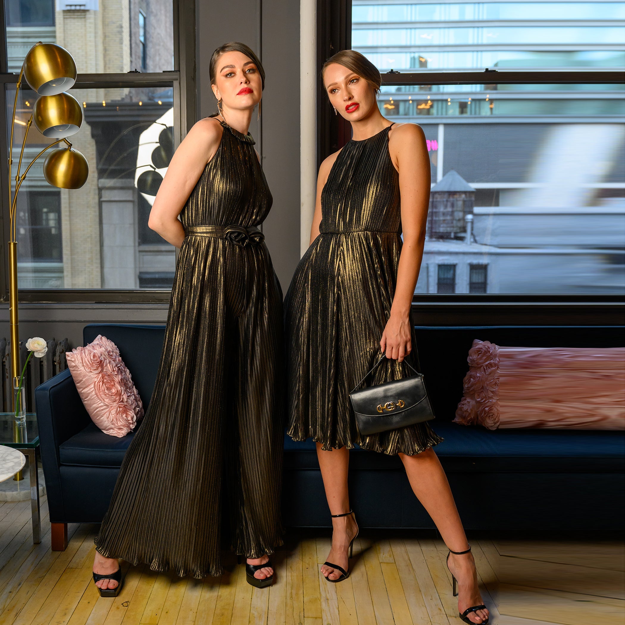 Exude elegance and elevate your appearance with The Bardot's Unique Halter Palazzo Jumpsuit. Meticulously tailored from opulent Pleated Luxered Novelty Fabric in a striking combination of gold and black, this jumpsuit is guaranteed to make a statement. The sophisticated halter neckline and eye-catching rose belt accentuate your figure, while the palazzo style offers unparalleled comfort and freedom of movement. From formal occasions to evenings out, the full length design exudes timeless class and refinement. Make a lasting impression and command attention with this dazzling piece.