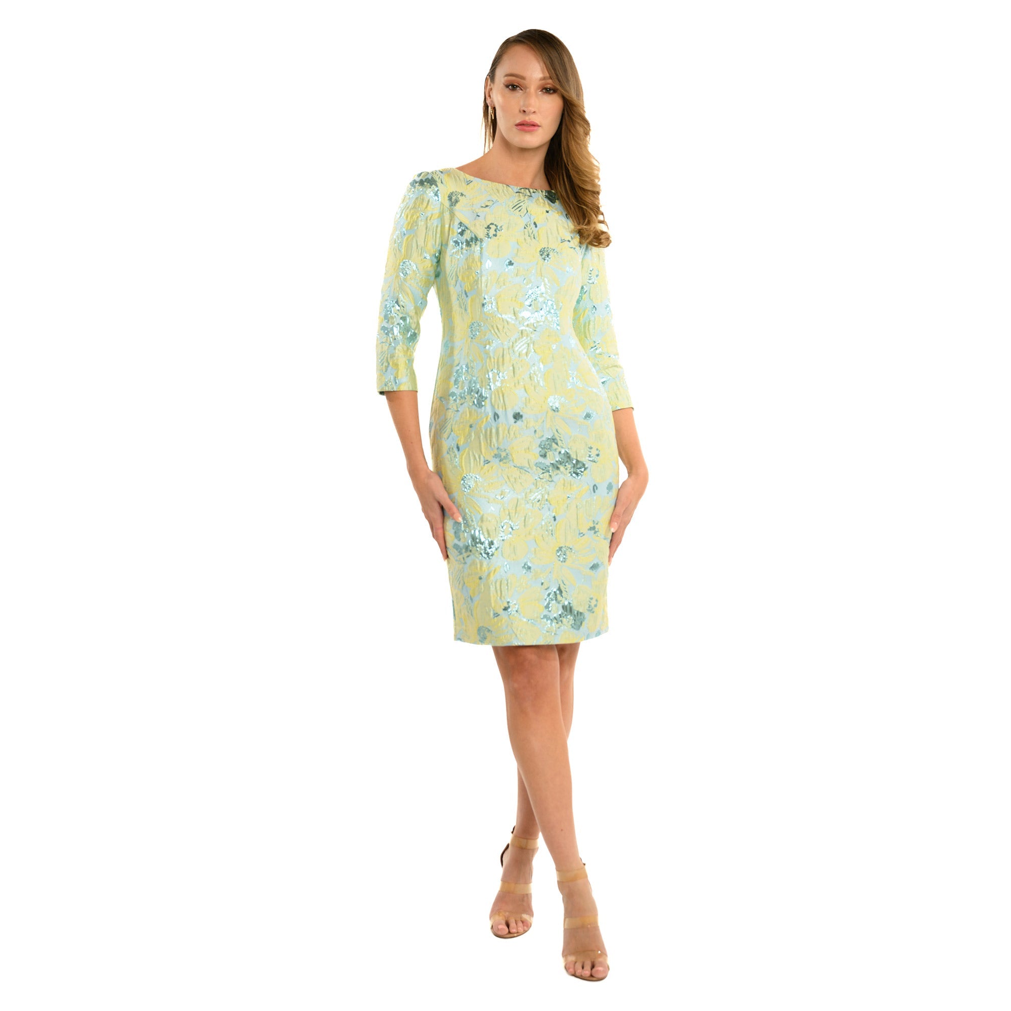 Choose The Isabella. This elegant, understated garment comes in spectacular shades of Pink with Gold, Lavender and Silver, or Green and Blue. With so many tones available, you can craft it into any look. And when you don the Novelty Jacquard Fabric, you'll sense the serenity and comfort. Its intricate pattern with 3/4 sleeves and snug fit gives it the perfect royal feel. Step into this dress and unleash your inner royal.