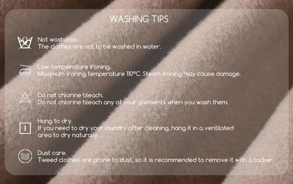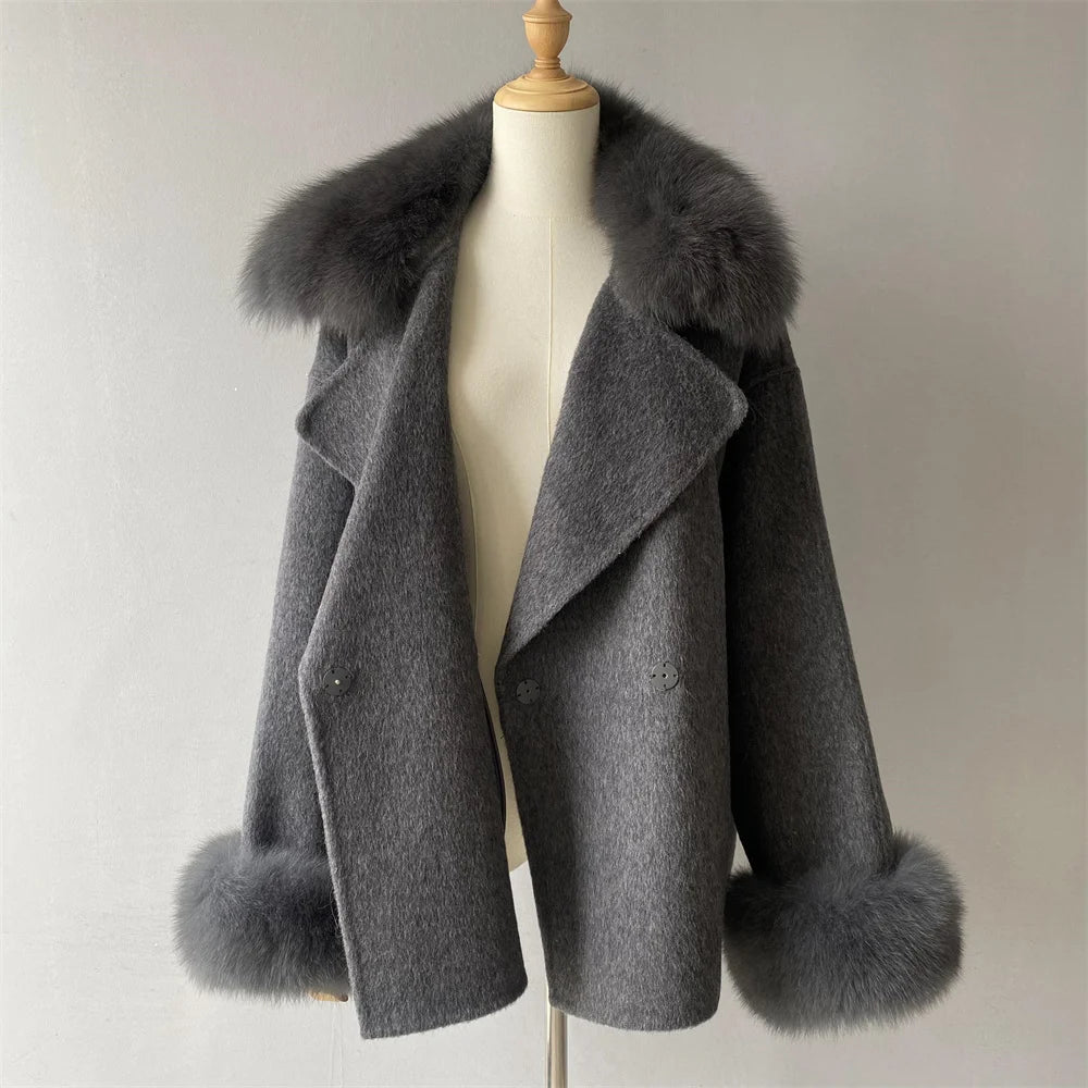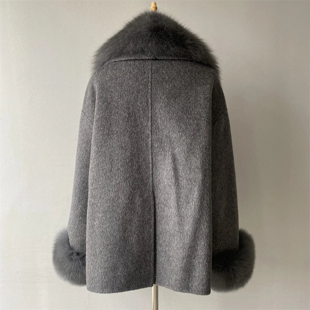 To maintain the quality of the wool and real fox fur, professional dry cleaning is recommended. Avoid machine washing to preserve the luxurious texture and appearance.